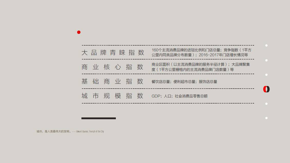 2017年5月,新一线城市研究所将发布《2017中国城市商业魅力排行榜》,通过160个主流消费品牌的商业数据库和包括阿里巴巴、滴滴出行、京东、美团大众点评、CBNData、时光网、飞常准、去哪儿、智联招聘、TalkingData、知乎、高德地图、青悦开放环境数据中心、咕咚运动、优酷、饿了么、支付宝等在内的互联网平台/机构用户行为数据,结合城市基础数据库,按照商业资源聚集度、城市枢纽性、城市人活跃度、生活方式多样性和未来可塑性五个维度加权计算,重新评估中国338个地级以上城市的商业魅力。