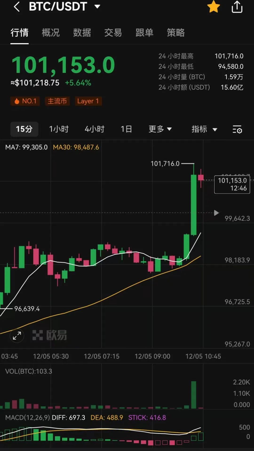 就在刚刚,北京时间12月5日,据HTX行情数据显示,比特币突破10万美元,现报 100099美元,创历史新高。
