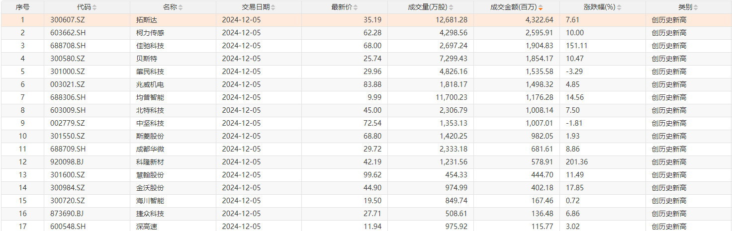 Choice数据统计,今日共有17只个股股价创历史新高,主要集中在交运设备、机械设备等行业,包括拓斯达、兆威机电、柯力传感、贝斯特、肇民科技等。