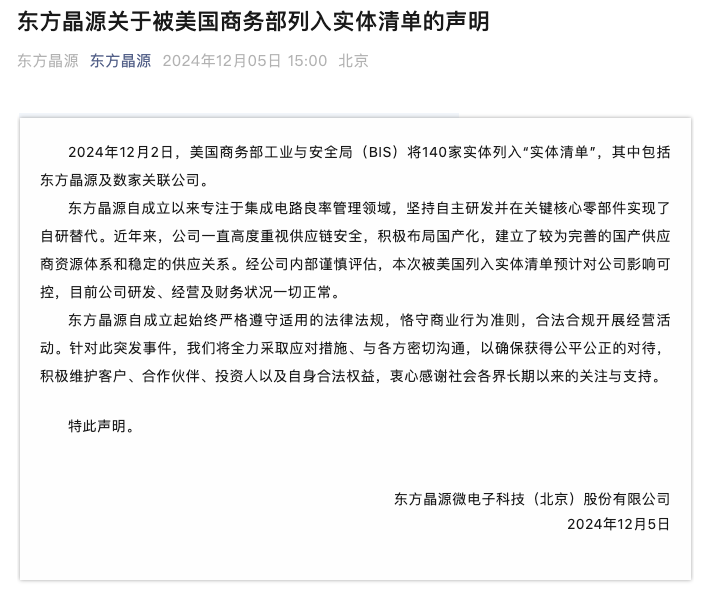 12月5日,东方晶源微电子科技(北京)股份有限公司发布声明称,2024年12月2日,美国商务部工业与安全局(BIS)将140家实体列入“实体清单”,其中包括东方晶源及数家关联公司。经公司内部谨慎评估,本次被美国列入实体清单预计对公司影响可控,目前公司研发、经营及财务状况一切正常。针对此突发事件,公司将全力采取应对措施、与各方密切沟通,以确保获得公平公正的对待,积极维护客户、合作伙伴、投资人以及自身合法权益。