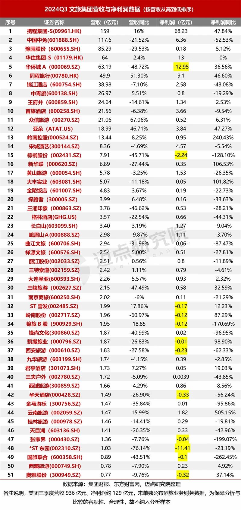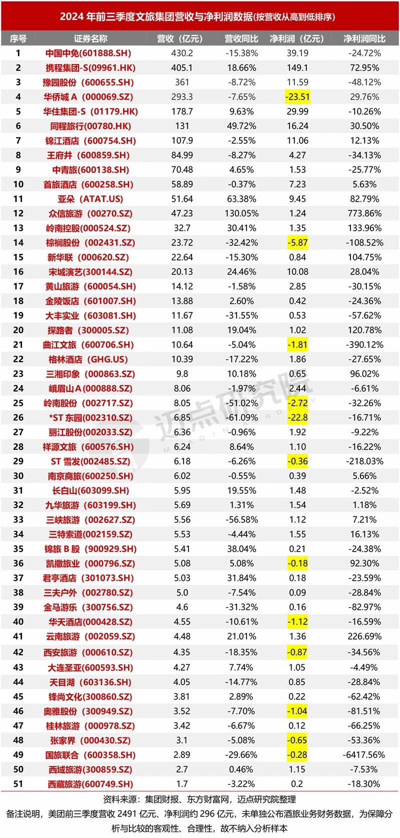2024前三季度文旅集团营收和净利润概况:51家文旅集团合计营收约2540亿元;39家企业盈利,占比约76%;旅行社类企业净利润同比增速较为突出