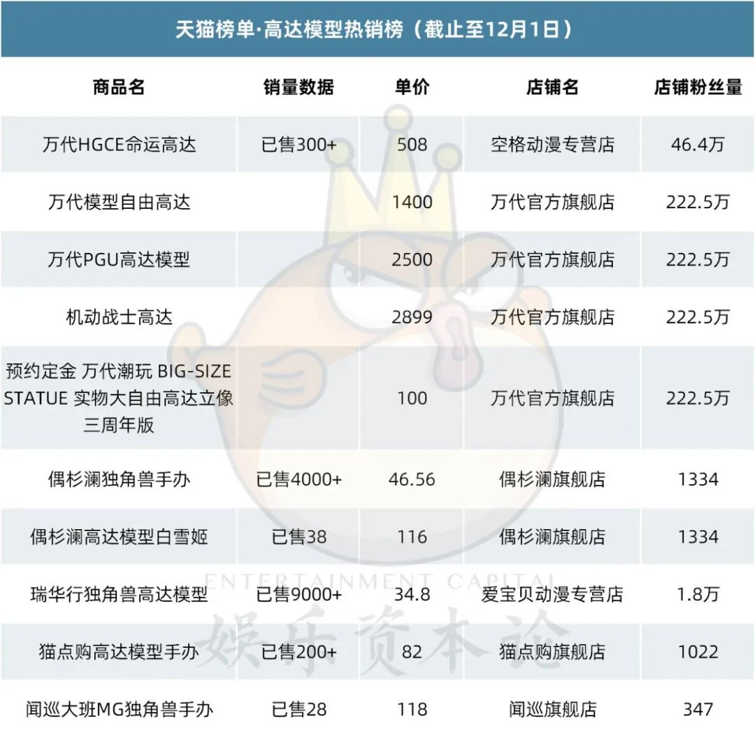 机甲模型方面,天猫高达模型热销榜上,万代官方旗舰店一骑绝尘,占据四个席位。其他上榜店铺分别是空格动漫专营店、偶杉澜旗舰店、爱宝贝动漫专营店、猫点购旗舰店、闻巡旗舰店。