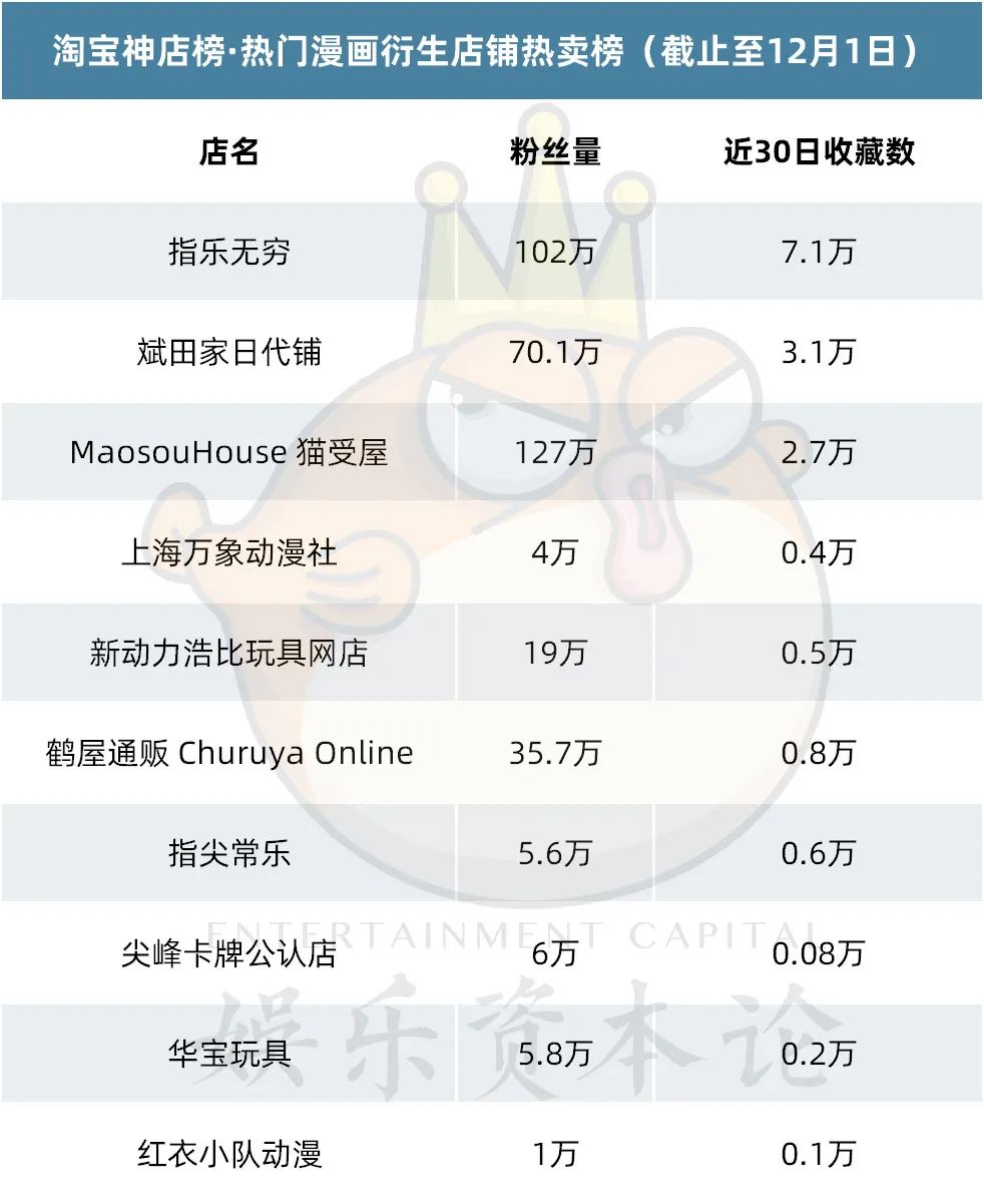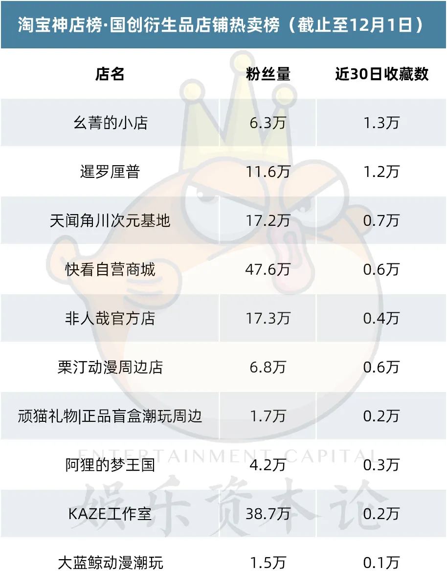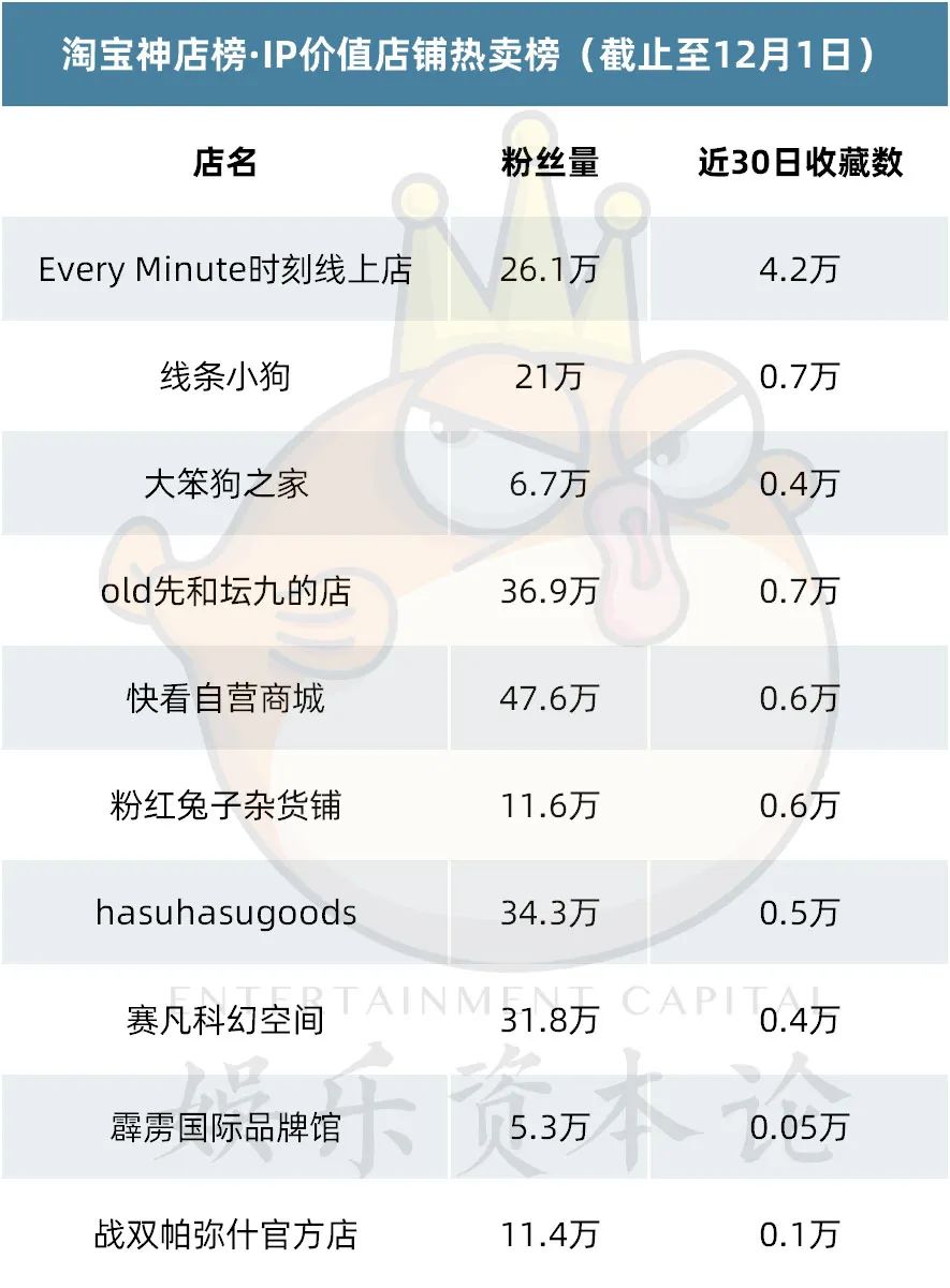 第四季度接近尾声,各上市玩具及潮玩公司相继发力,为年终的销量额努力。在“双十一”的热潮以及圣诞临近的节点下,天猫、淘宝各店铺陆续推出了不同的促销策略和新品系列,较之上次IP衍生品榜单统计,我们可以看到销量数据有明显增长,以Every Minute时刻线上店为例,近30日收藏数较之上期IP价值店铺榜首跃升5倍,更多文创周边也有不同程度的增长。下面让我们详细看一下11月IP衍生品榜单。