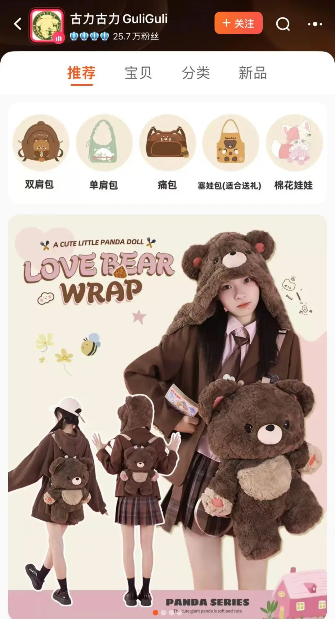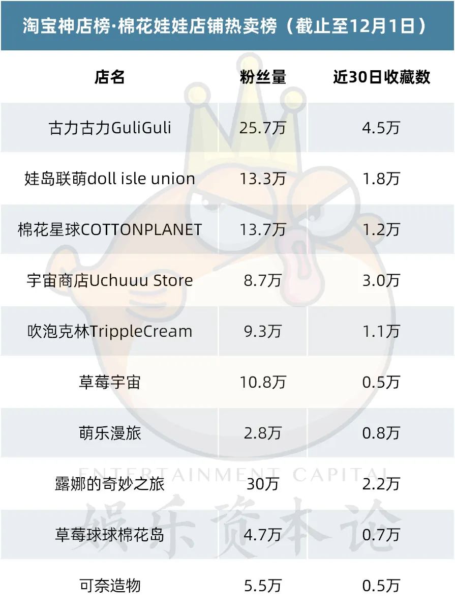 在上榜店铺中,古力古力GuliGuli、萌乐漫旅、露娜的奇妙之旅等店铺衍生售卖痛包、家居服等产品,进一步收割了大批粉丝。