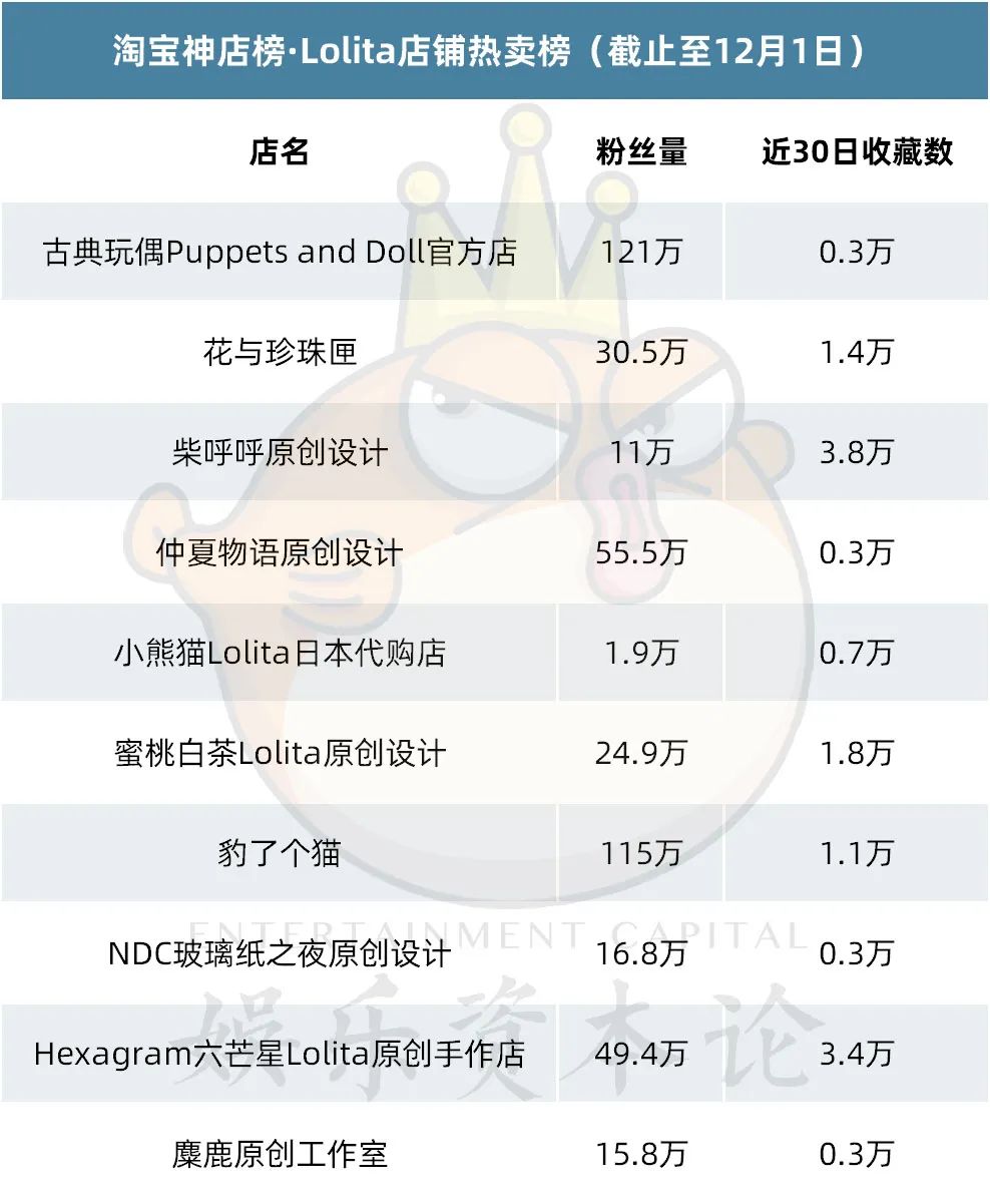 Lolita店铺热卖榜上,古典玩偶Puppets and Doll官方店位居第一,相比之下,Lolita店铺榜单更新较快,未形成明显的头部店铺,且与洛丽塔少女店铺榜相比,二者几乎完全不重合,两个榜单也形成了两种截然不同的品牌风格聚集地,Lolita店铺热卖榜中店铺以Lolita传统的甜系、哥特系、古典系为主,洛丽塔少女店铺榜上榜店铺则显现中华风、和服风等更多风格。