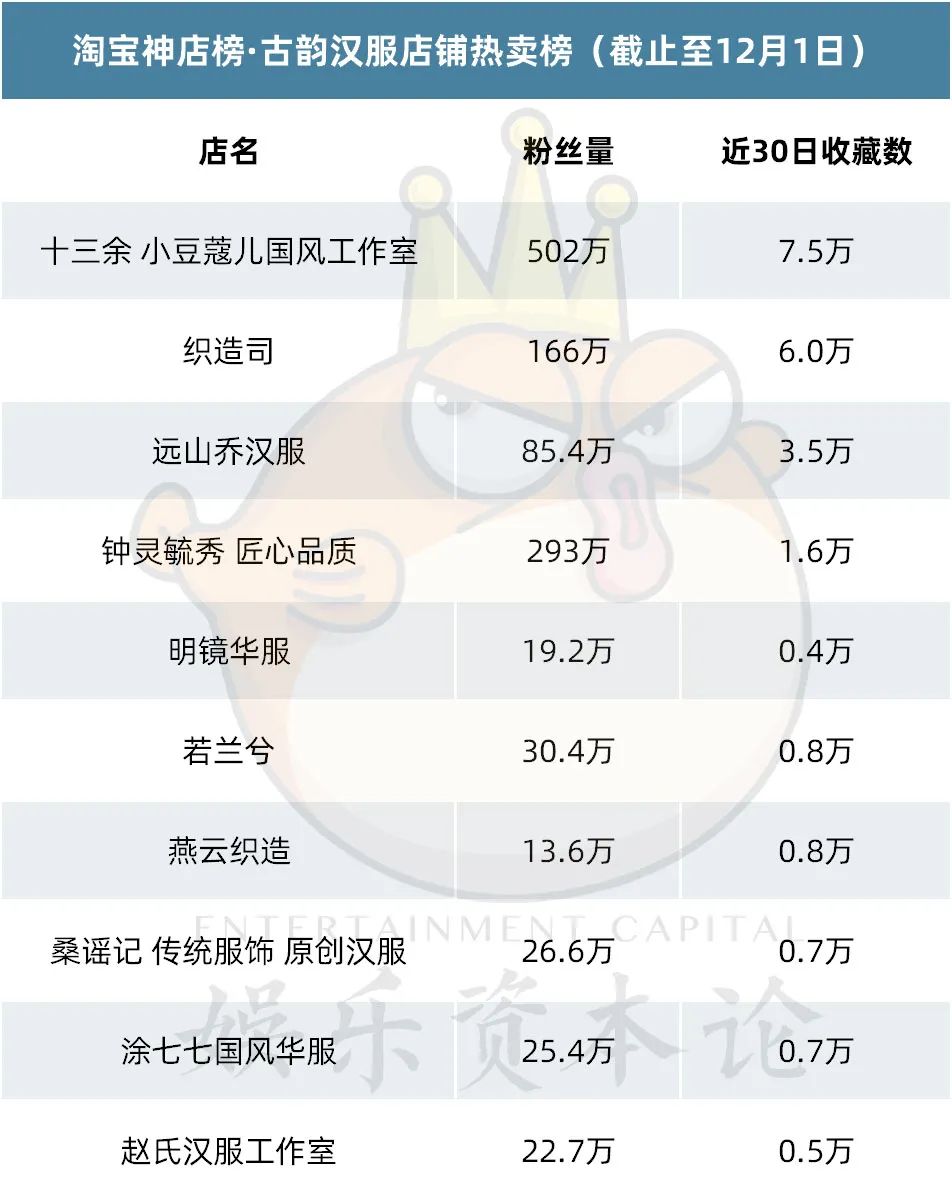 汉服店铺头部效应明显,十三余 小豆蔻国风工作室、织造司、远山乔汉服、钟灵毓秀 匠心品质等老牌汉服店铺稳定上榜,粉丝忠诚度较高,其余店铺之间粉丝量、收藏数彼此差距不大,更迭速度较快。