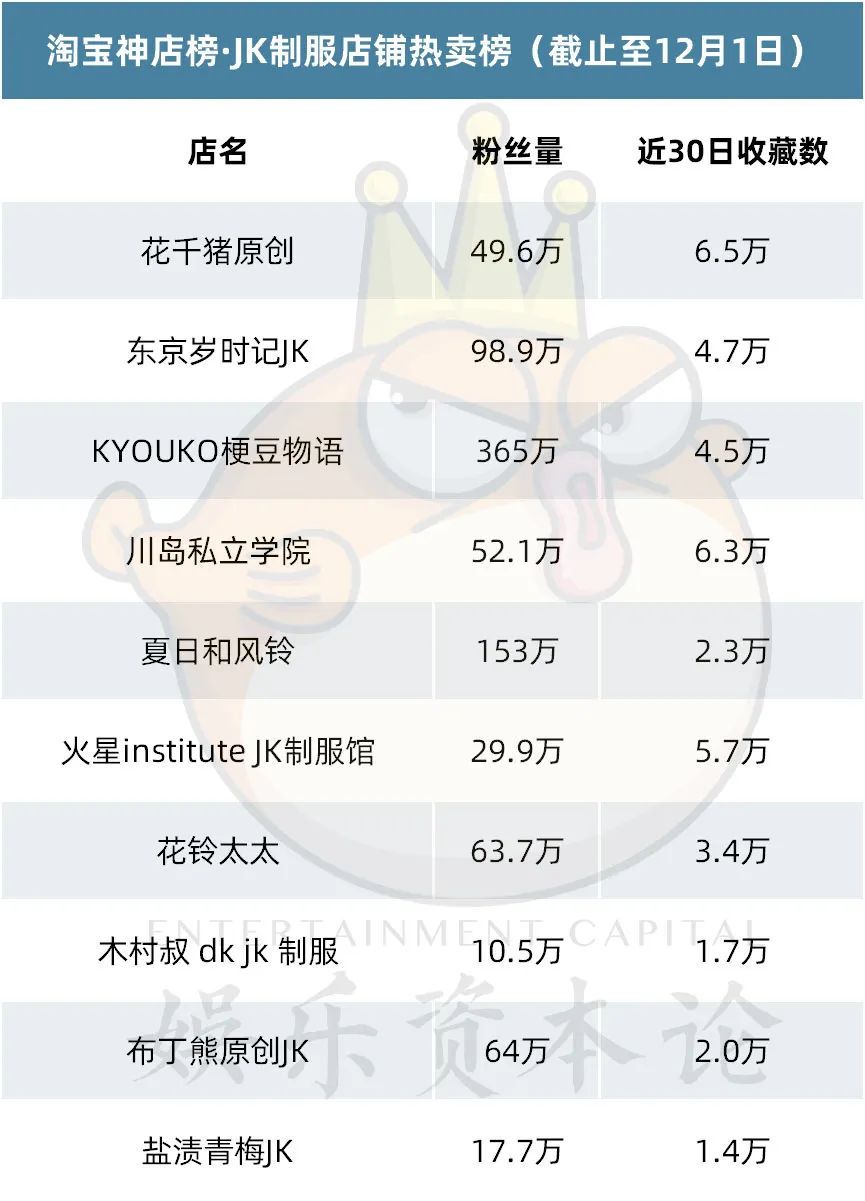 JK制服店铺榜中,总体格局变化不大,花千猪原创、东京岁时记JK、KYOUKO梗豆物语、川岛私立学院等七家店铺再度上榜,粉丝量增长都在10W左右,收藏数较七月有明显增长。