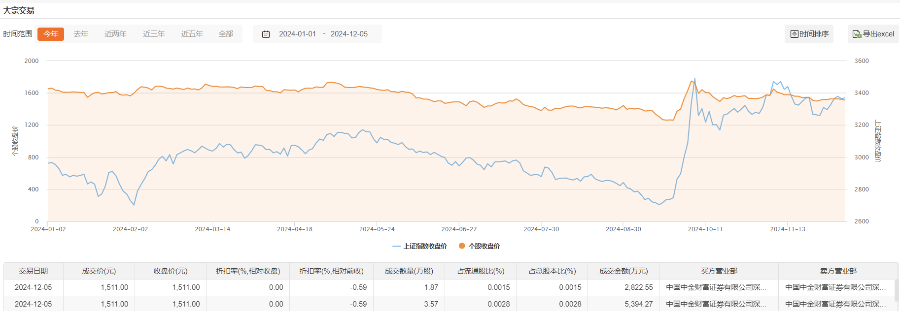 12月5日,贵州茅台今日大宗交易成交5.44万股,成交额8216.82万元,占当日总成交额的3.26%,成交价1510.44元,较市场收盘价折价0.04%。