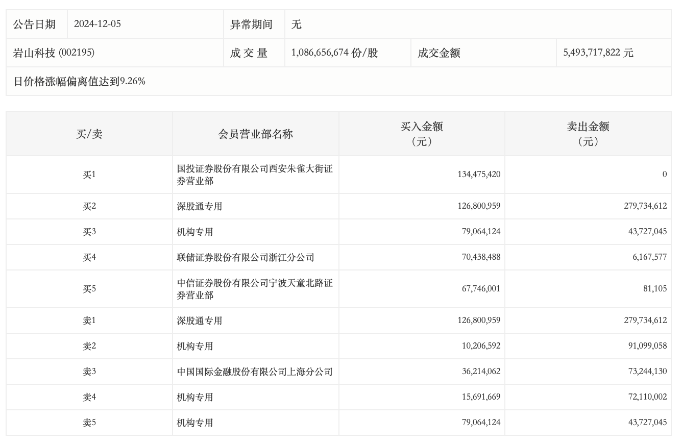 12月5日,岩山科技今日涨停,龙虎榜数据显示,上榜营业部席位全天成交11.07亿元,占当日总成交金额比例为20.15%。其中,买入金额为5.41亿元,卖出金额为5.66亿元,合计净卖出2552.62万元。