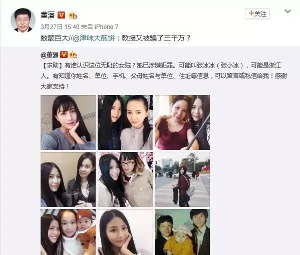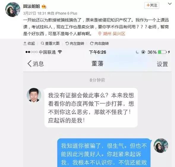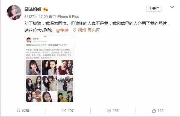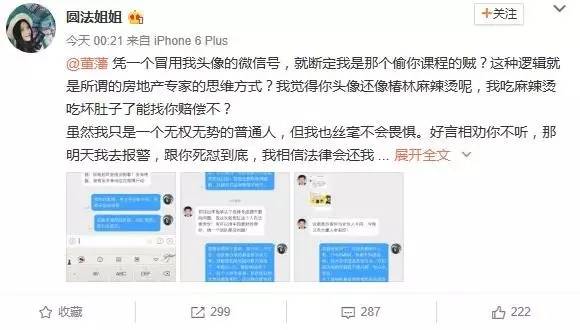 随后,一位名为@圆法姐姐的女士也通过微博回应,称被微信好友盗用照片,自己并没有欺骗董藩教授。