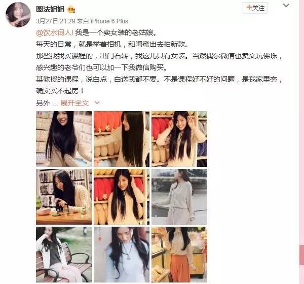 @圆法姐姐在微博上自称,只是一个卖女装的老姑娘,教授的课程白送都不要,因为买不起房。