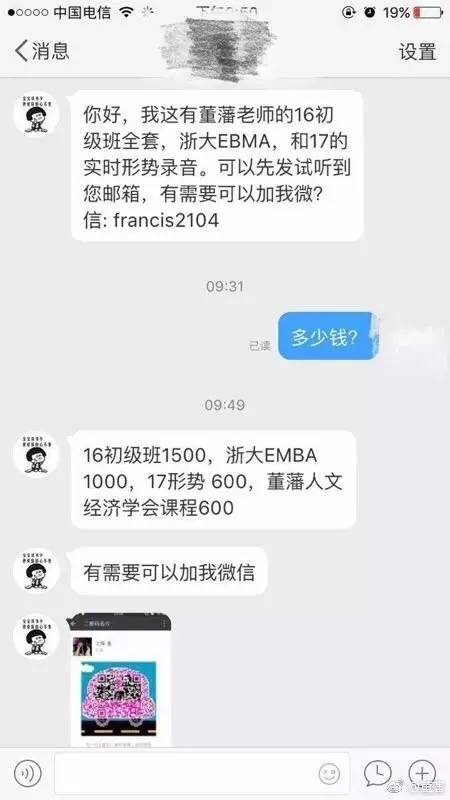 原来啊,是有人通过非法手段将教授的EMBA课程录音,然后再以600-1500的价格卖出去。董藩教授也在微博上公布了证据。
