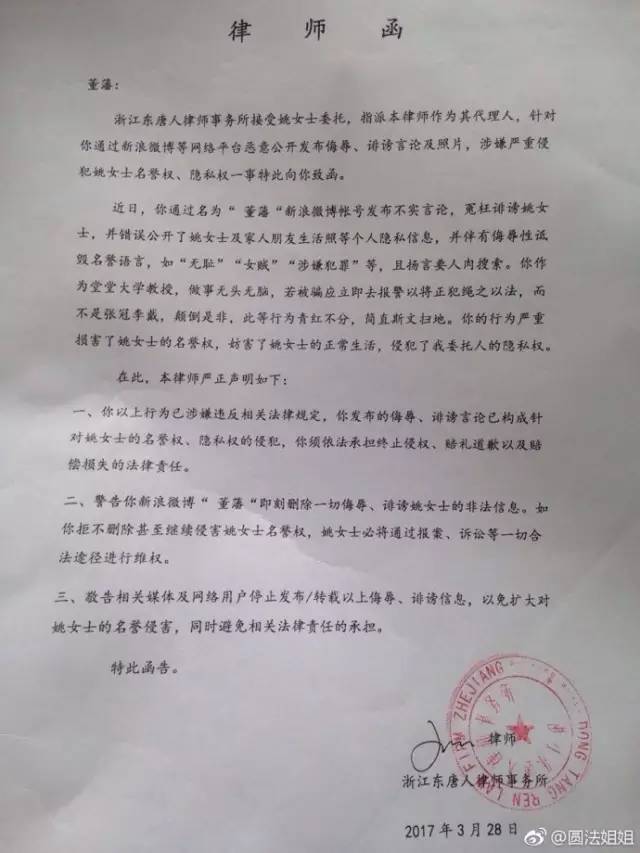 美女微商还晒出了委托浙江东唐人律师事务所给董藩教授发的律师函。