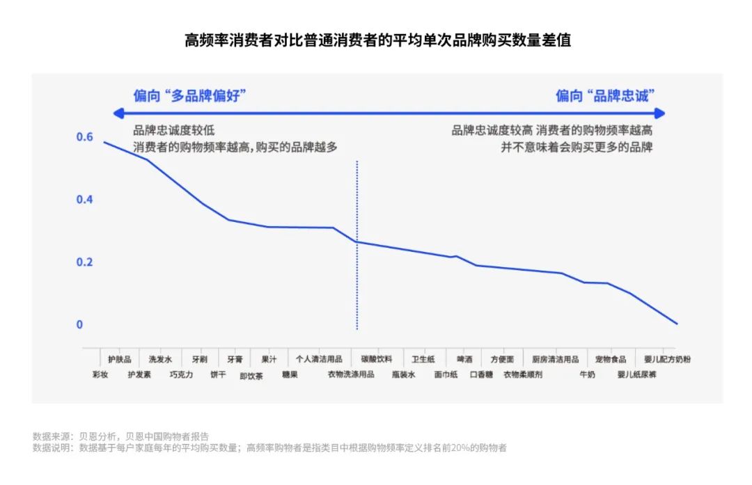 品牌经营的第三层视野盲区是在消费者偏好复杂多元化的当下,精准定位需求的难度增加。贝恩分析调研数据显示,超70%的消费者对品牌出现一定频率的更换行为。消费者不仅难以对特定品牌产生亲密感,也会对不同品类呈现出“多品牌偏好”与“品牌忠诚”的分化。品牌更需要挖掘不同场景下的痛点,找到给消费者的最优解。