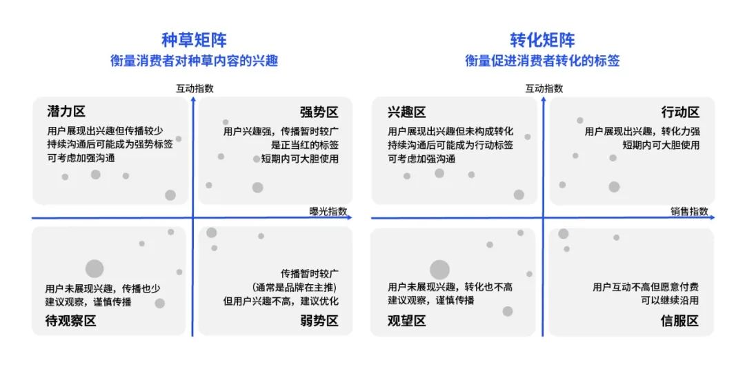 品牌经营的第五大视野盲区在于投入的盲目性,导致ROI难以科学量化提升,品牌内容营销无法有效转化为业务增长。《报告》指出,内容种草的有效性在于精准把握标签矩阵策略,品牌需要灵活应用从种草到转化的两大标签矩阵模型,从多维度分析标签,识别行业优质标签、优化弱势区标签,打通种草到拔草的路径。