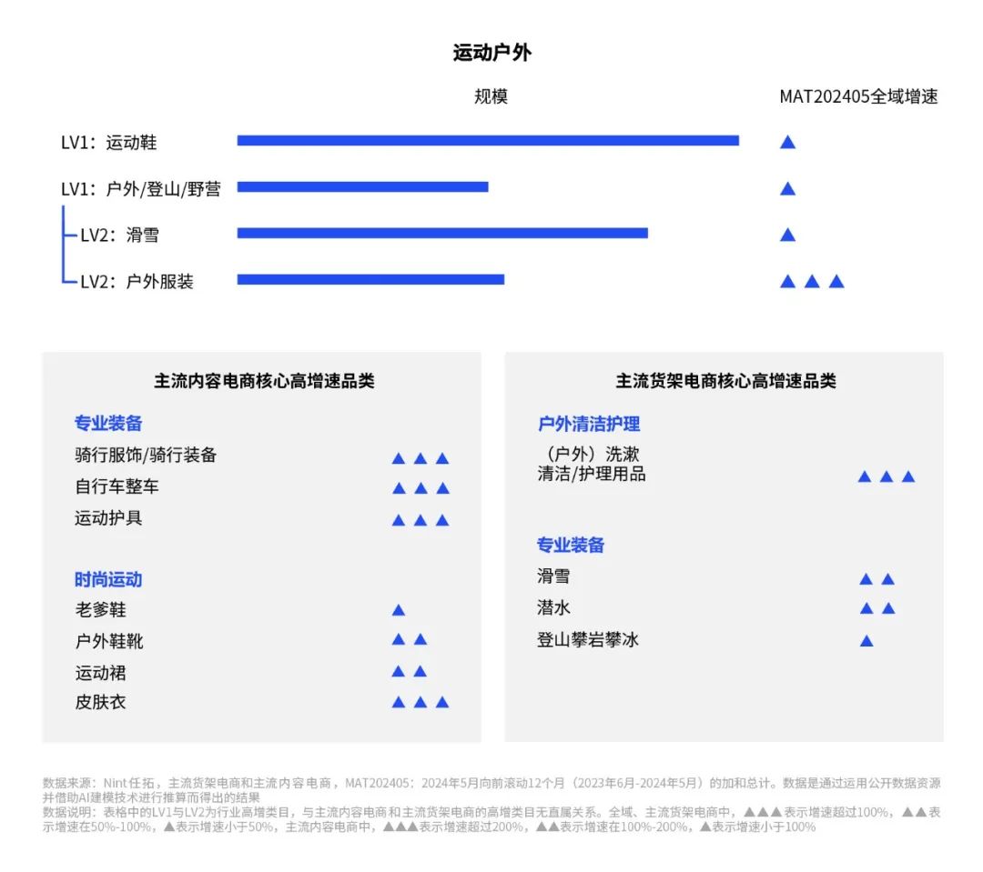 比如,《报告》发现运动户外品类正朝向小众运动“大众化”及专业装备“时尚化”演变。滑雪、攀岩等小众运动相关的专业服饰装备成为大众选择;同时随着都市户外、球迷风等运动通勤穿搭风格的风靡,老爹鞋、运动裙等时尚运动单品也在快速增长。