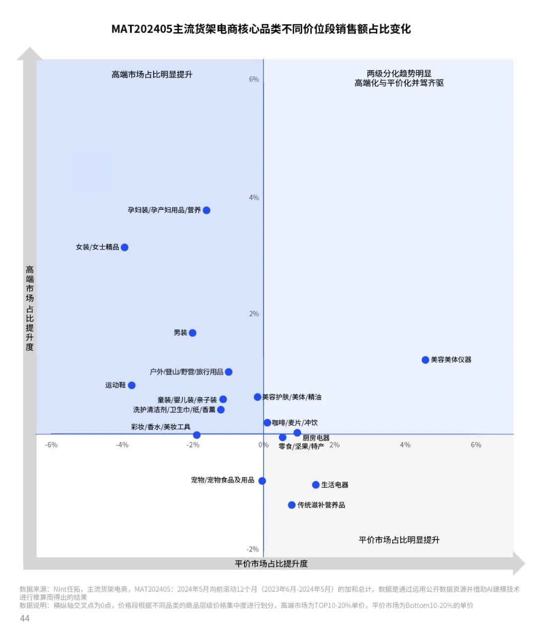 母婴、服饰、户外等品类呈现高端市场占比明显提升的趋势。其中,服饰的高品质和独特设计是高端市场的主要增长动因。因产品缺乏突破性创新,价格竞争激烈,零食、生活电器等品类呈现消费大众化的趋势;美容美体仪器、厨房电器、饮料等品类则中间市场萎缩,平价与高端市场更受欢迎。其中美容美体仪器的高端市场受创新科技驱动,平价市场上直发梳这类服务于更小场景的产品获得增长。