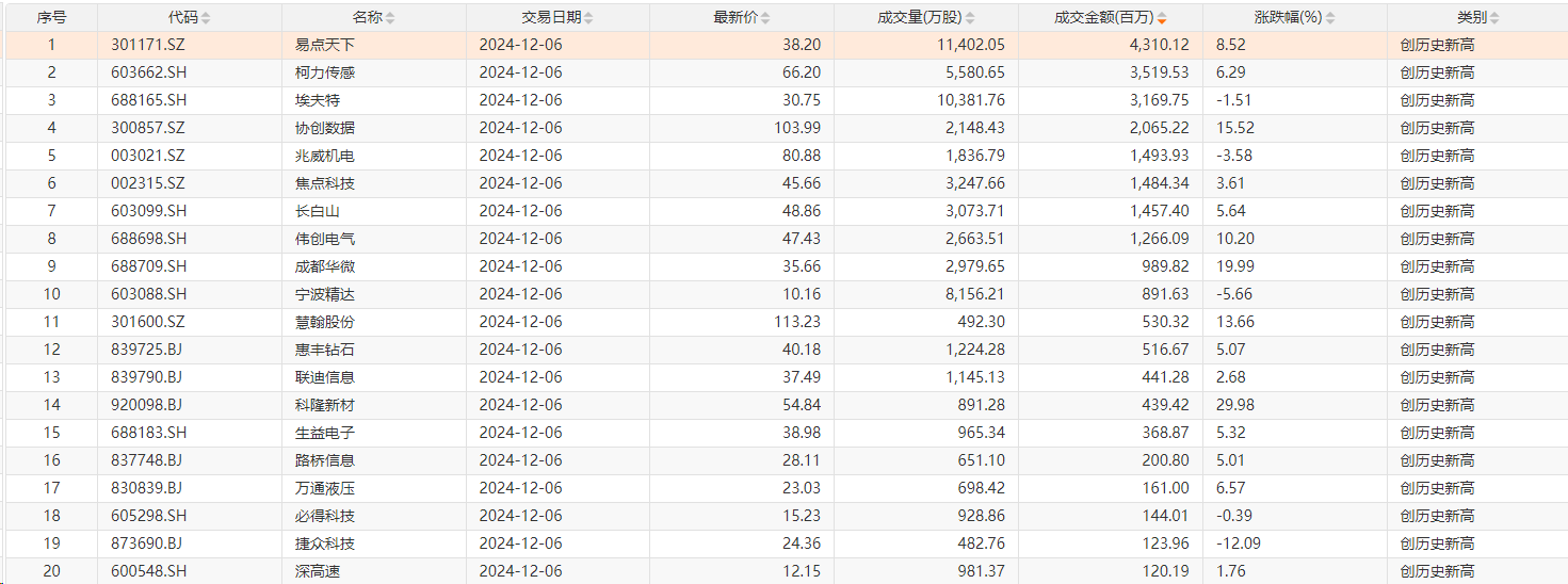 Choice数据统计,今日共有20只个股股价创历史新高,主要集中在交运设备、机械设备等行业,包括易点天下、兆威机电、柯力传感、协创数据、宁波精达等。