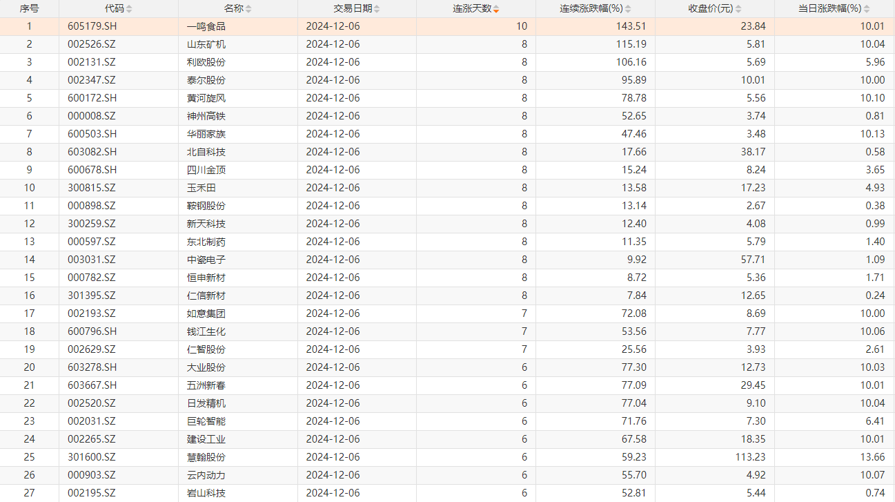 Choice数据统计,今日1只个股连续10天上涨,为一鸣食品;15只个股连续8天上涨,包括山东矿机、利欧股份、神州高铁等;此外,如意集团、钱江生化、仁智股份连续7天上涨。
