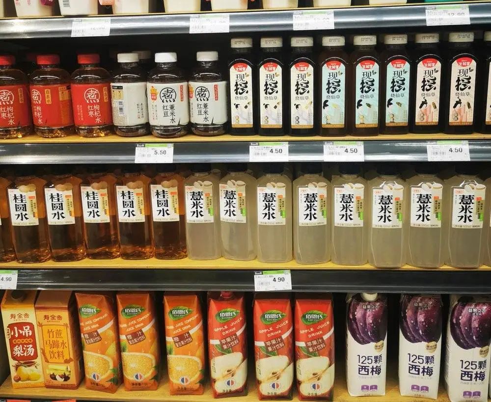 走进任何一家超市,你都能轻易找到中式养生水的身影。它们被摆放在货架和冰箱的显眼位置,有的甚至在便利店门口设置了“养生水专车”,方便顾客选购。
