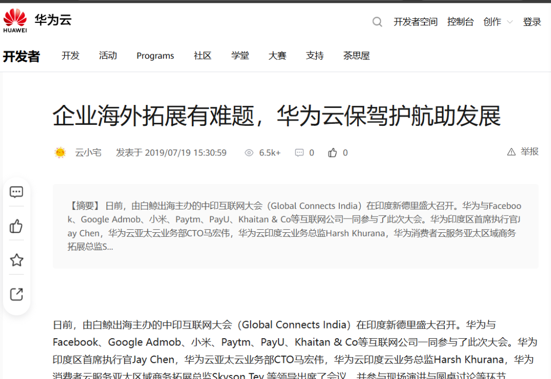 几乎所有中国云服务都明白“池塘和鱼”关系。华为云官网博客上一篇名为《企业海外拓展有难题,华为云保驾护航助发展》文章,该稿件直接指出: