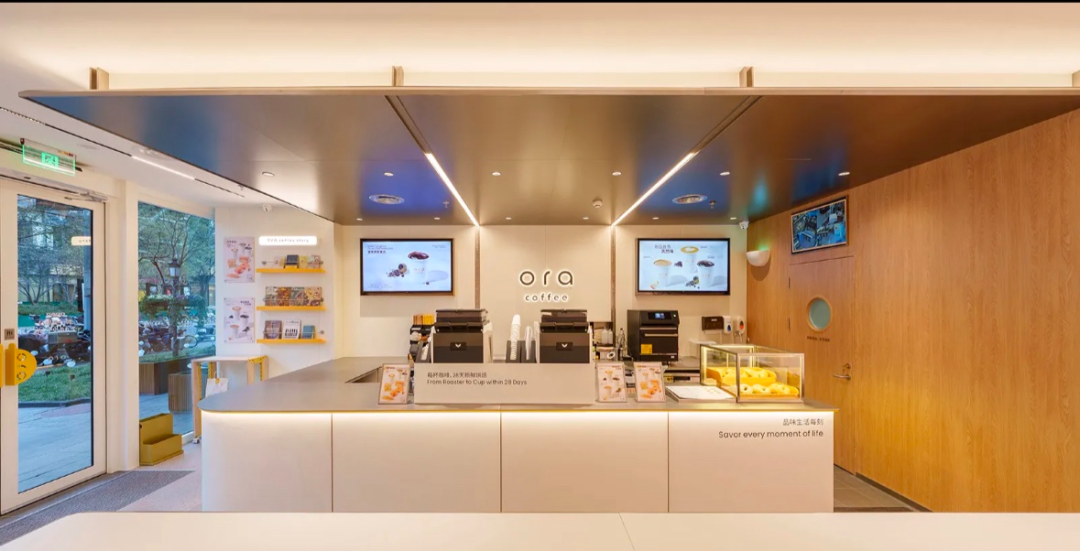 在门面上,Ora Coffee和Manner、M stand的简洁风类似,店内以奶油白、银色、木质装饰为主,配以暖黄的招牌与灯光,面积小于常见的皮爷大店。“空间较小,座位比较少,更适合外带的上班族。”有用户评价称。