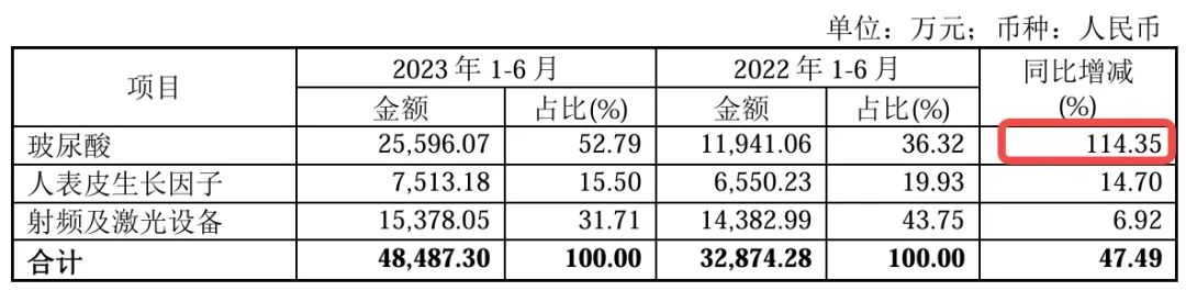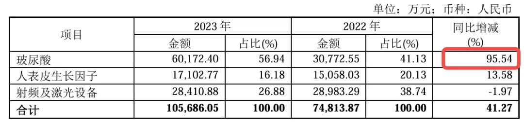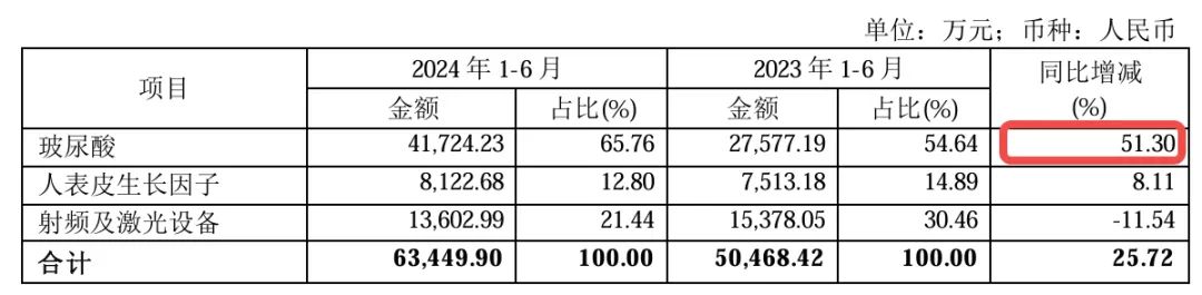 而具体到医疗美容与创面护理产品中,玻尿酸贡献了4.17亿元收入,同比增长51.3%,收入占比达65.8%。