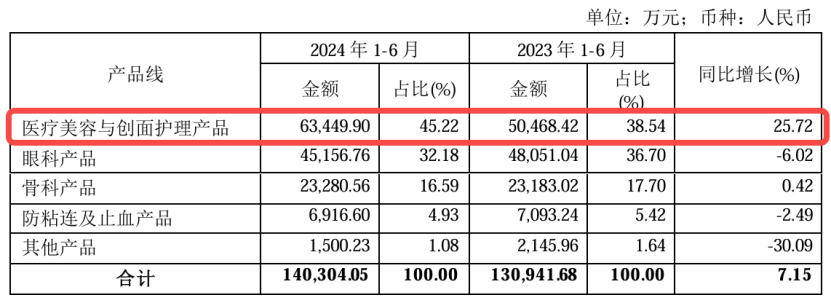 公司虽然保持增长,但从细分产品线来看,除医疗美容与创面护理产品同比增长25.72%,骨科产品微增0.42%,其他产品线均在下滑。
