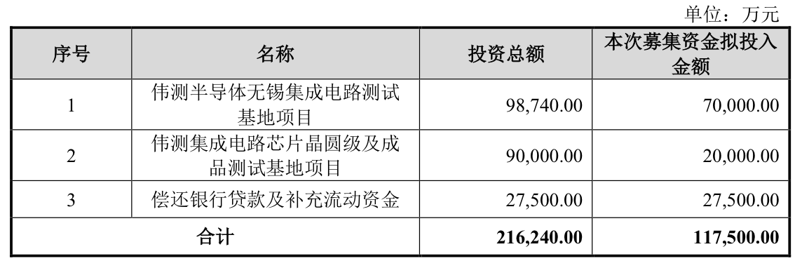 伟测科技这次计划融资11.75亿元,投入到3个项目,“伟测半导体无锡集成电路测试基地项目”7亿元,“伟测集成电路芯片晶圆级及成品测试基地项目”2亿元,补充流动资金2.75亿元。