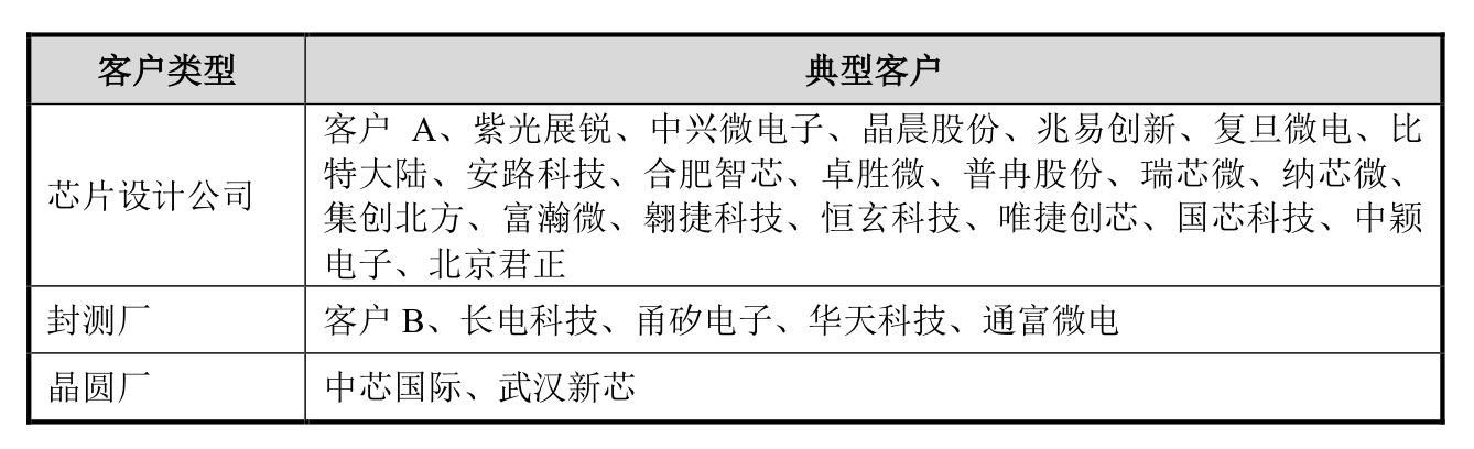 截至目前,伟测科技客户数量200余家,客户涵盖芯片设计、制造、封装、IDM等类型的企业,其中不乏客户A、紫光展锐、中兴微电子、晶晨股份、兆易创新、复旦微电、比特大陆、安路科技、客户B、甬矽电子、卓胜微、普冉股份、中芯国际、瑞芯微、纳芯微、集创北方、翱捷科技等。
