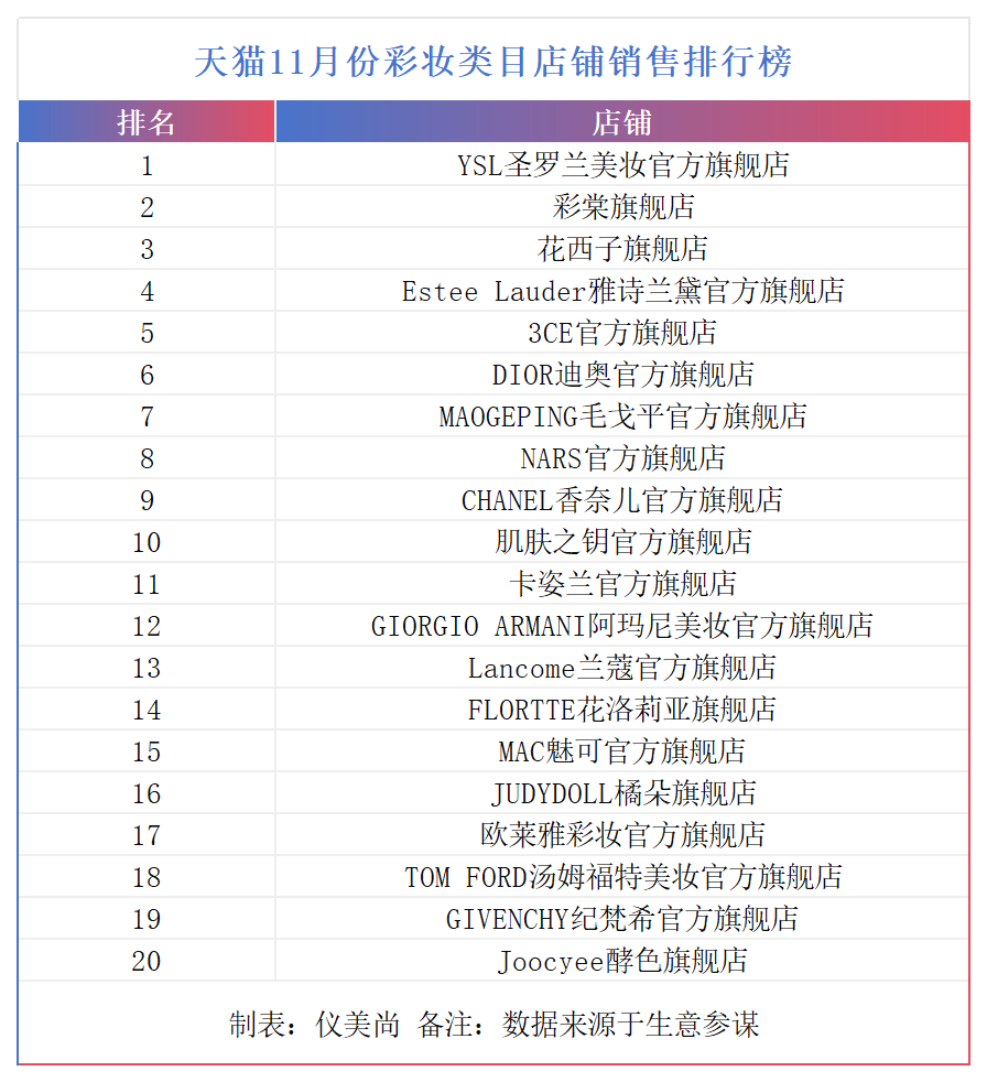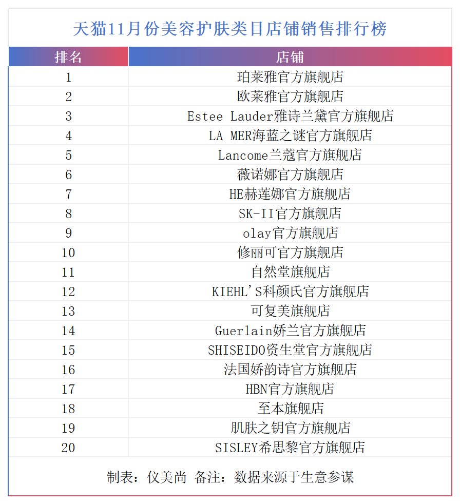 从整体看,TOP20榜单的店铺排行比较稳定,排名上升最多的至本和希思黎,都上升了8个名次;排名下降最多的修丽可,也仅下降了4个名次。