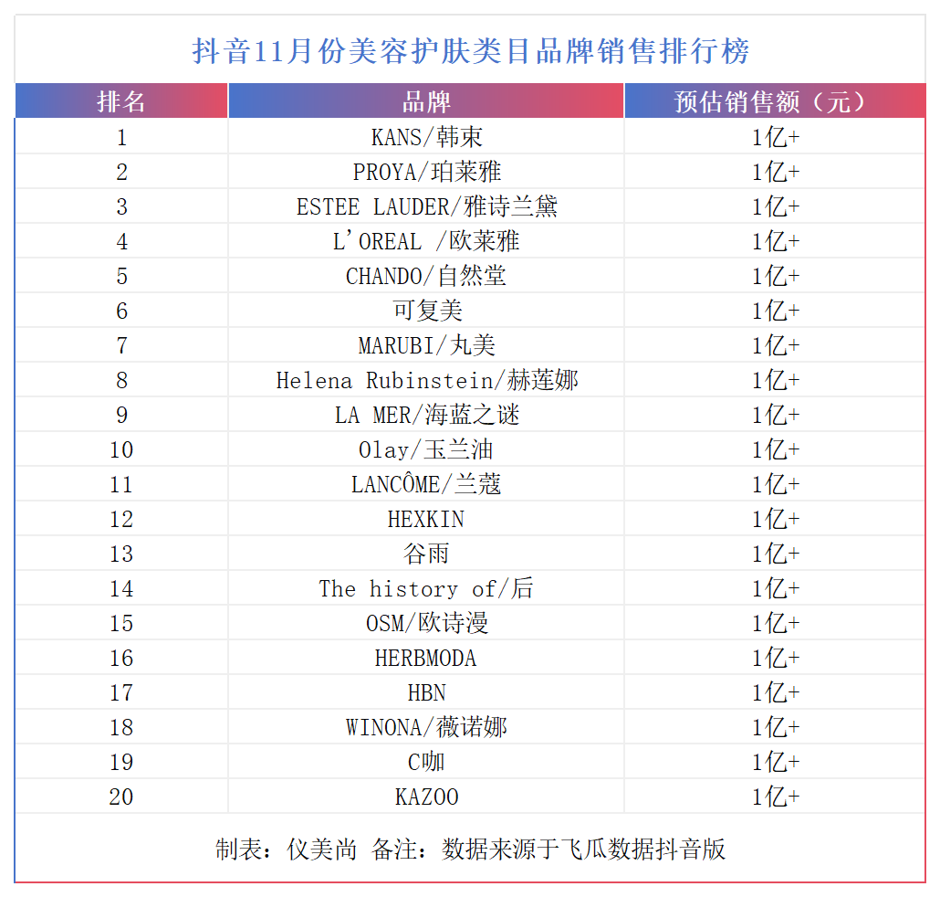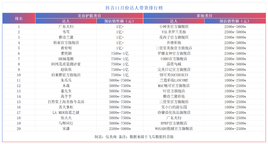 飞瓜数据抖音版显示,11月,抖音美容护肤类目带货达人榜中,一共有10位达人的预估最高销售额达到1亿元。除了广东夫妇、韦雪、黄宥明、董艳颖、阿纯和赵依依外,还有雅诗兰黛、韩束、HR赫莲娜和珀莱雅等4个品牌自播账号。