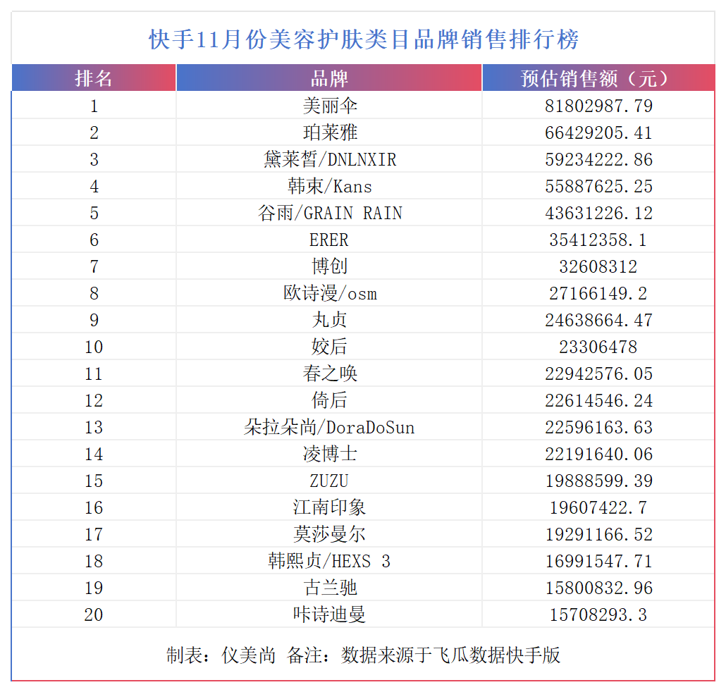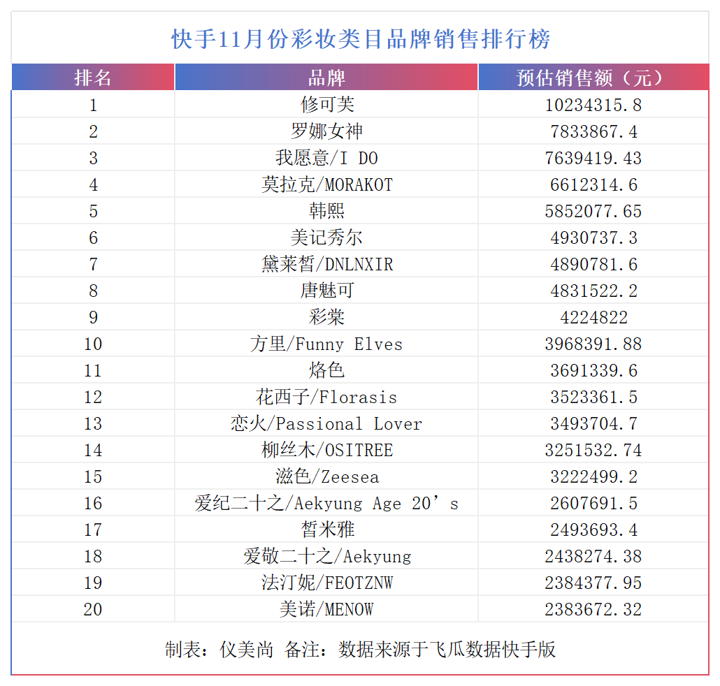 在快手,国货彩妆品牌同样是“主力军”。飞瓜数据快手版显示,在11月的快手彩妆排行榜上,挤入TOP20的国际品牌仅有来自韩国的爱纪二十之上榜,其余全部为国货彩妆。