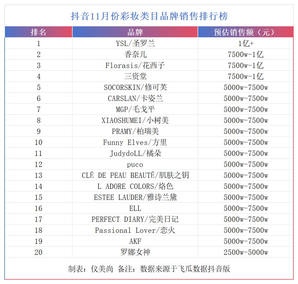 除了花西子之外,三资堂、卡姿兰、毛戈平、小树美、柏瑞美、方里、橘朵、PUCO、烙色、ELL、完美日记、恋火和罗娜女神等14个国货彩妆品牌也跻身TOP20榜单之列。
