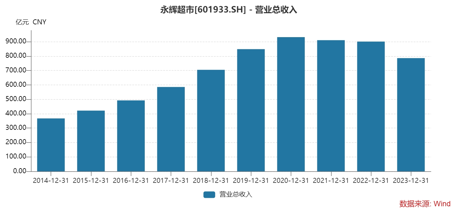 永辉在中国零售圈的地位毋庸置疑,但过去几年永辉的发展却难言乐观。2020年,永辉超市创下931.99亿元的收入高点后就止步不前,并持续小幅下降;近年来,永辉超市始终难以盈利。