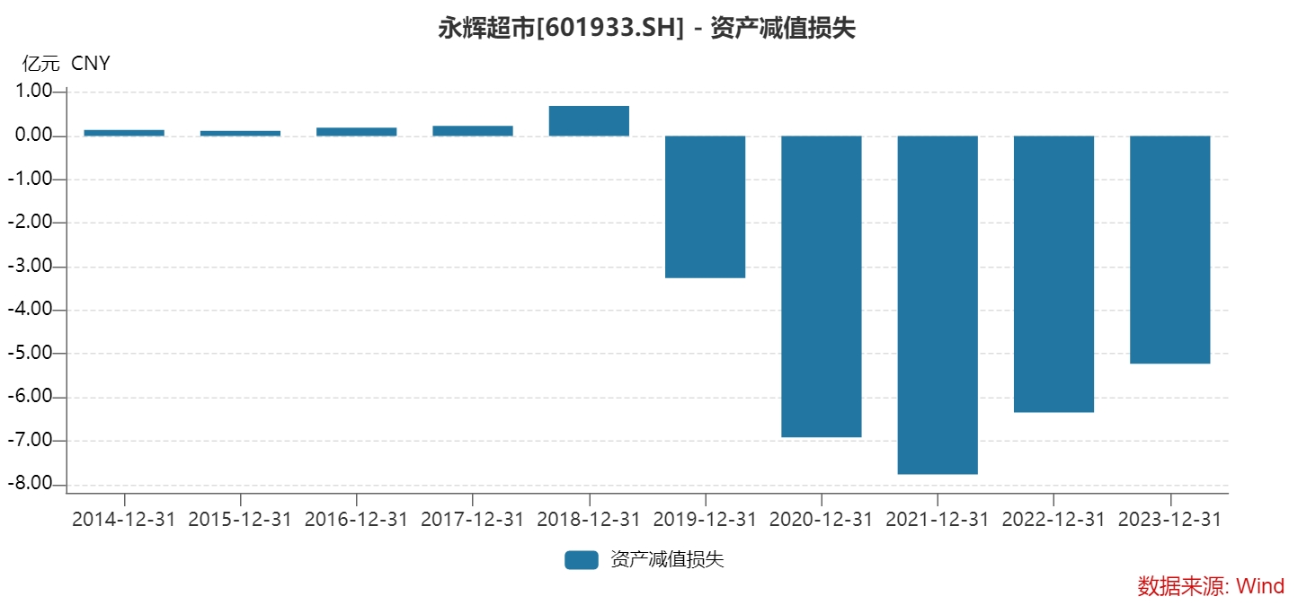 也正是在2019年后,永辉超市持续出现资产减值损失。2019-2023年5年间,永辉累计资产减值损失近30亿元,进一步拖累了公司的盈利能力。