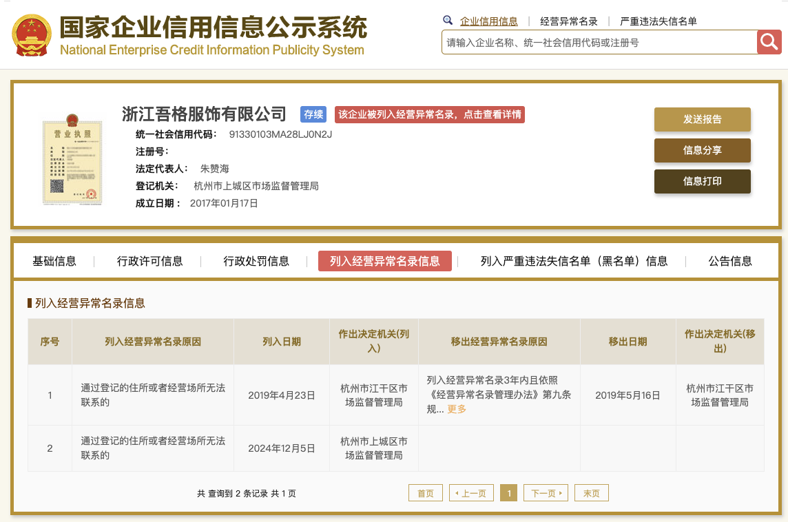 国家企业信用信息公示系统网站显示,2024年12月5日,因通过登记的住所或者经营场所无法联系,浙江吾格服饰有限公司被杭州市上城区市场监督管理局列入经营异常名录。