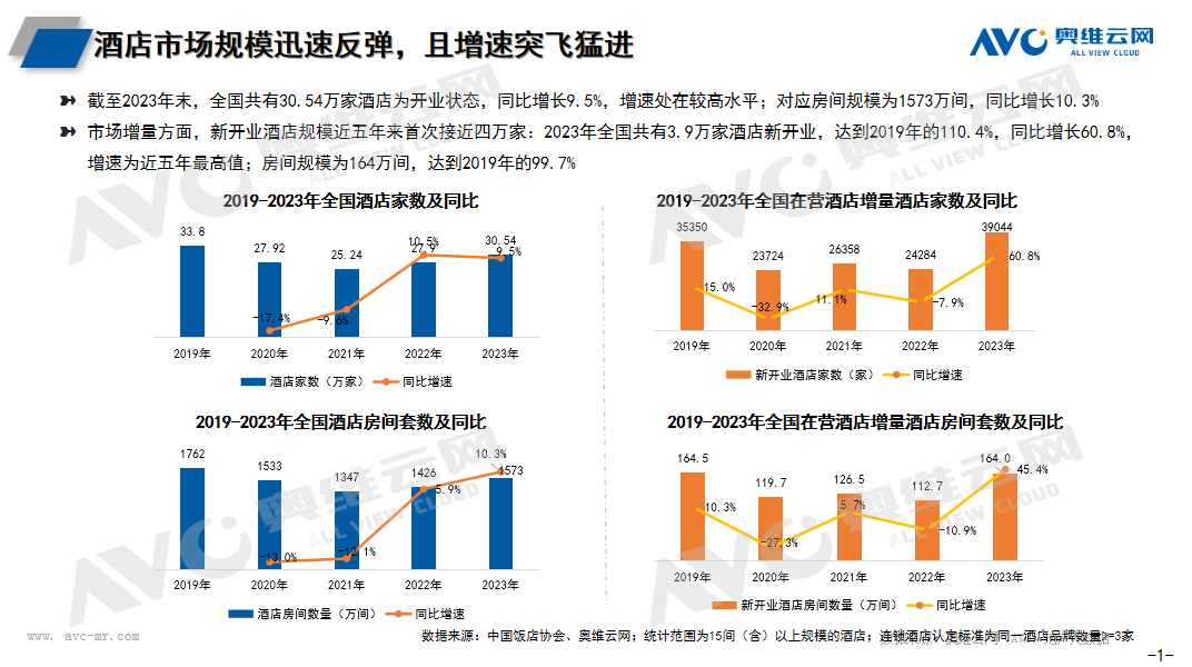 奥维云网数据显示,截至2023年末全国共有30.54万家酒店为开业状态,新开业酒店规模近五年来首次接近四万家。