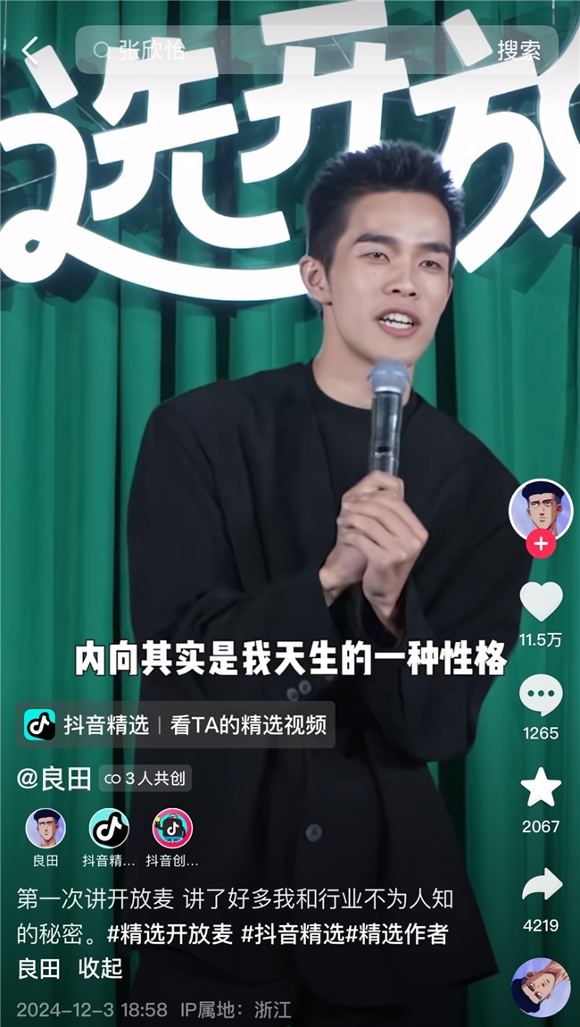 这是良田第一次尝试开放麦,他用一段幽默自嘲开场。评论区里,不少网友认出了他,默契地为他加油点赞。拥有这样超高人气的良田,一开始其实很内向。