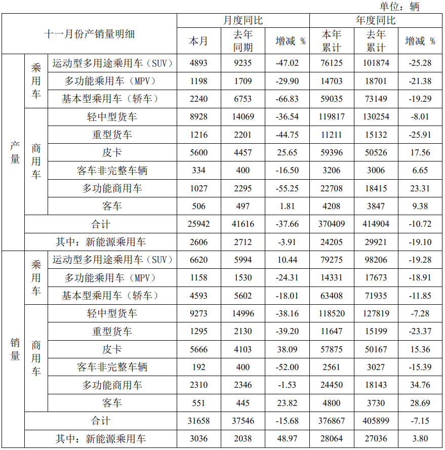 1-11月产量合计37.04万辆,同比下降10.72%;销量合计37.69万辆,同比下降7.15%。