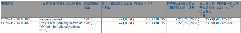 港交所文件显示,12月6日,腾讯大股东、南非Naspers集团荷兰子公司Prosus出售47.4万股腾讯控股H股,每股平均价410.0358港元,持股比例由24.01%降至23.99%,现持股总数约22.24亿股。今年以来Prosus减持腾讯速度有所放缓,据此前披露,4月初至9月底半年减持约7058.61万股腾讯,套现33亿美元;10月1日至11月27日期间进一步沽出2642.45万股,持股降至22.27亿股左右。