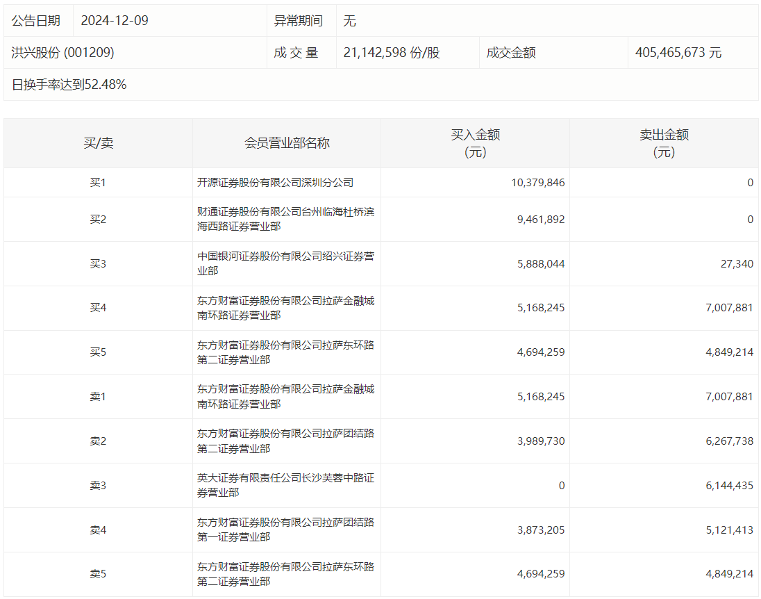 洪兴股份今日跌6.28%,龙虎榜数据显示,上榜营业部席位全天成交7287.32万元,占当日总成交金额比例为17.97%。其中,买入金额为4345.52万元,卖出金额为2941.8万元,合计净买入1403.72万元。