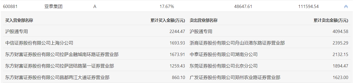 亚泰集团今日跌3.04%,龙虎榜数据显示,上榜营业部席位全天成交1.99亿元,占当日总成交金额比例为17.81%。其中,买入金额为7731.85万元,卖出金额为1.21亿元,合计净卖出4407.63万元。