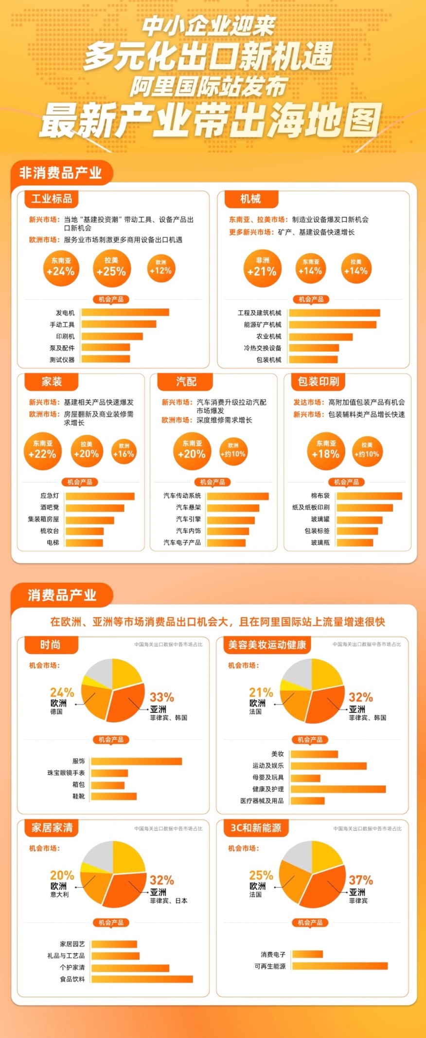 与此同时,阿里国际站发布的最新产业带出海地图显示,非消费品产业如工业标品、机械、家装、汽配、包装印刷等在东南亚、拉美新兴市场和欧洲市场都有出口新机会。消费品产业则在欧洲、亚洲等市场出口机会大,且在阿里国际站上流量增速快,包括时尚、美容美妆运动健康、家居家清、3C和新能源等行业。