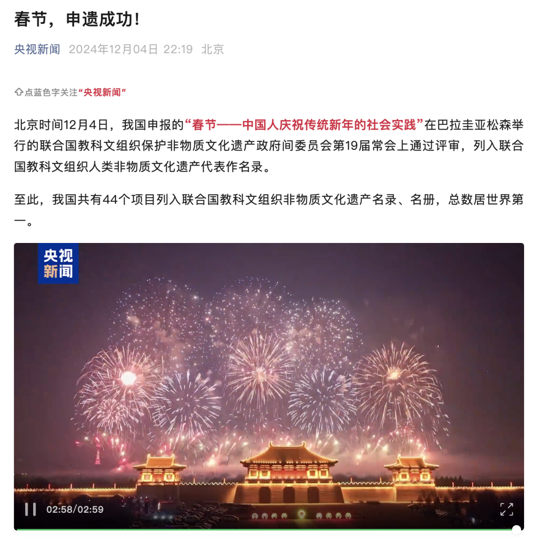 12月4日,中国申报的“春节——中国人庆祝传统新年的社会实践”通过评审,列入联合国教科文组织人类非物质文化遗产代表作名录。至此,我国共有44个项目列入联合国教科文组织非物质文化遗产名录、名册,总数居世界第一。
