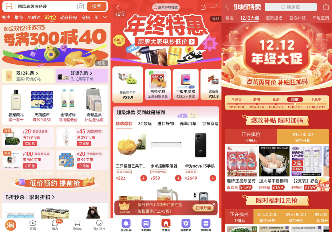 首先看这段时间一直和白酒别苗头的电商平台,双十二也没卸下战力。在双十一因低价产品进行过几轮纷争之后,各大电商平台的内卷走到双十二。值得一提的是,2025的春节比2024年来得稍早一些,当前,淘宝、京东、拼多多虽然仍然以“双十二”在进行大促,但部分品牌和直播间已经早早喊起来“年货节”号子。