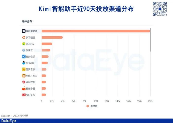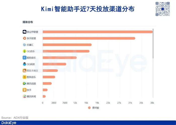 ADX行业版数据显示,截至12月5日,近7天Kimi智能助手投放渠道以穿山甲联盟、快手联盟为主,优量汇、QQ音乐、酷狗音乐、QQ阅读等腾讯系媒体平台紧随其后。