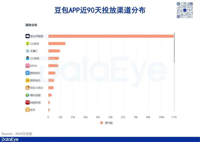 ADX行业版数据显示,截至12月6日,豆包近90天投放渠道分布以穿山甲联盟为主,占比76.08%,QQ音乐位于第二位,占比10.43%;