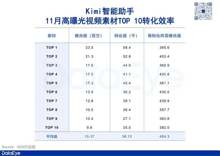 对比之下,Kimi在11月高曝光素材视频TOP 10平均每名转化用户所需曝光量为404.3,游戏高曝光素材相比TOP 10素材转化效率要低9.8%。