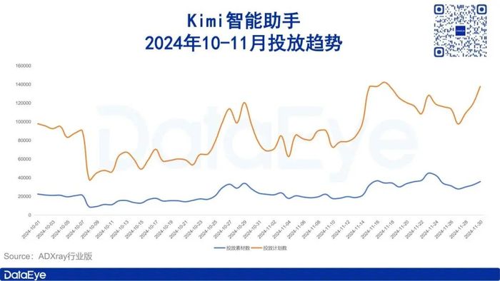 ADX行业版数据显示,2024年10月至11月,Kimi智能助手共投放39万+组素材,其中图片28万+组,视频11万+组,且11月素材量环比10月增长39.1%。